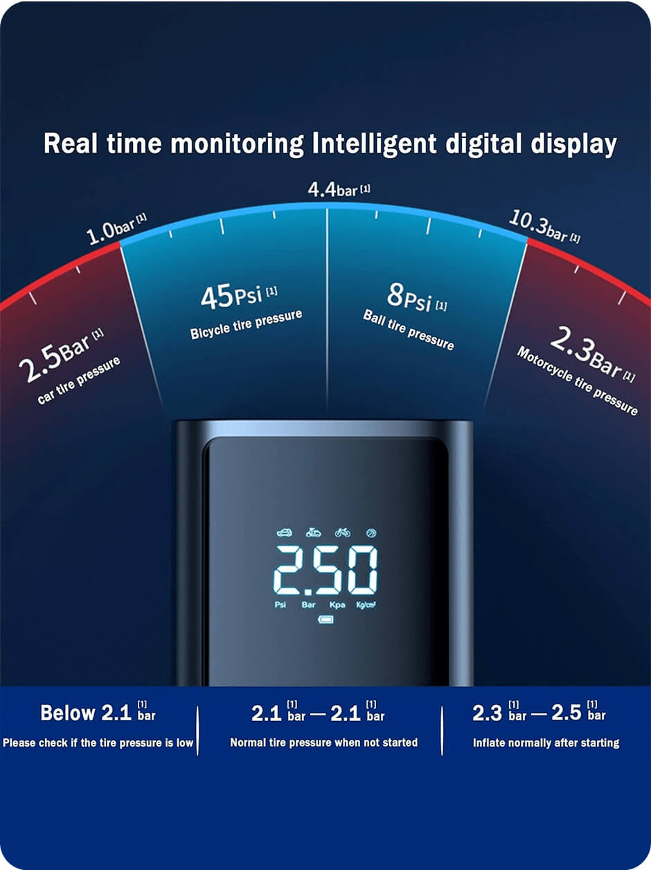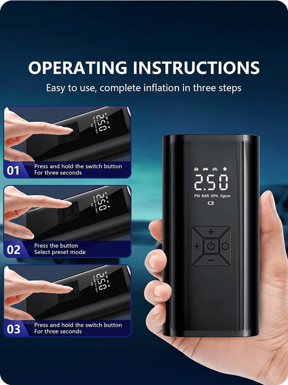 Stay prepared anywhere with our Air Pump, your compact smart pump. Never get stranded again—save time and money by inflating your tires quickly, no tow trucks or gas stations needed. Our Air Pump delivers powerful inflation pressure at 150 PSI with one-touch presets and interchangeable adapter tips. The ultimate on-the-go tool for road trips, biking, camping, and more!